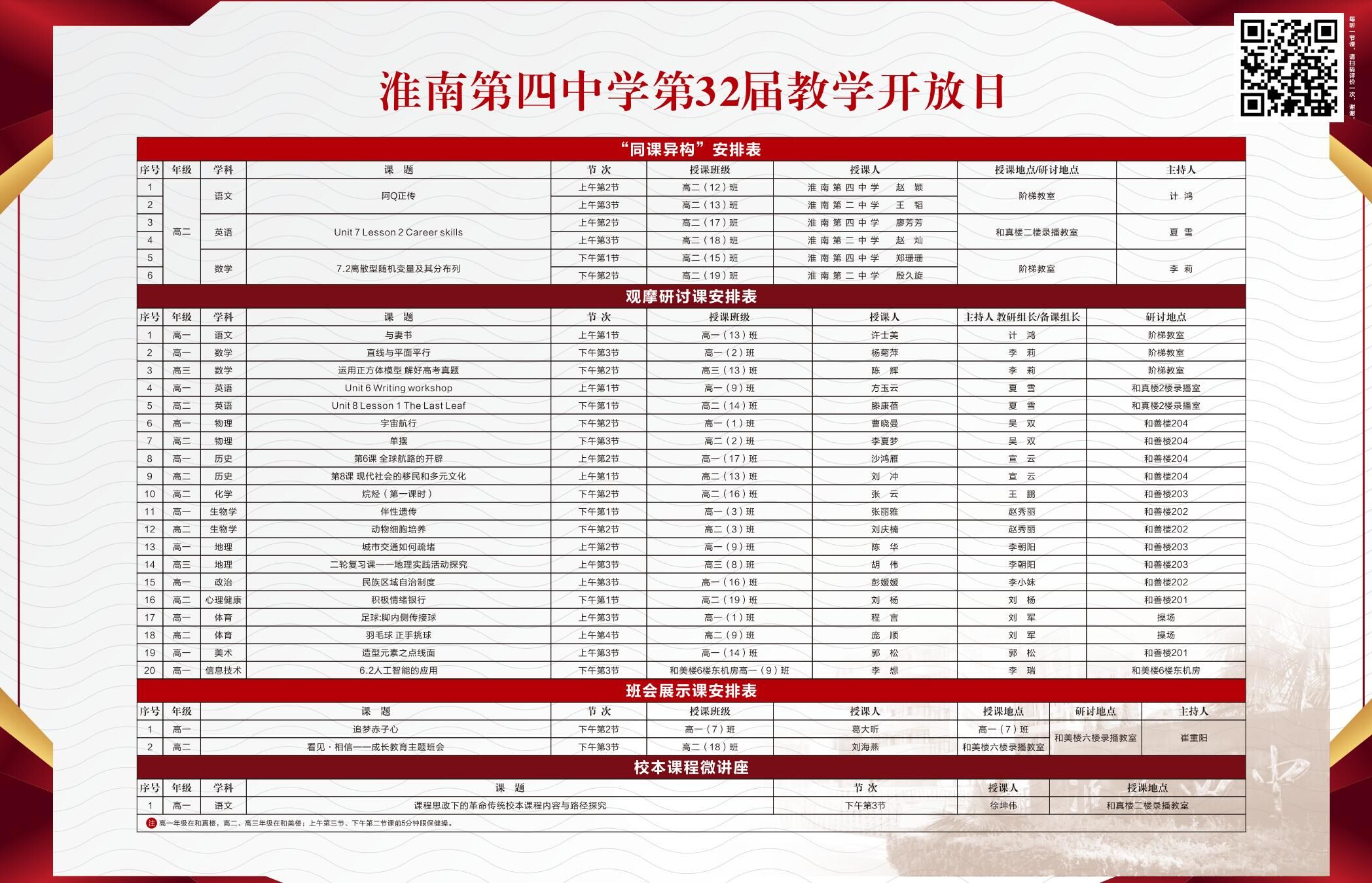 为提高教育教学质量,促进校际合作交流,4月17日,淮南第四中学举办了第32届教学开放日活动。本次活动面向全市教师开放和淮南四中全体学生家长开放。作为新课程新教材团队化研究第三组牵头校,我校对此次活动做了精心的安排。
