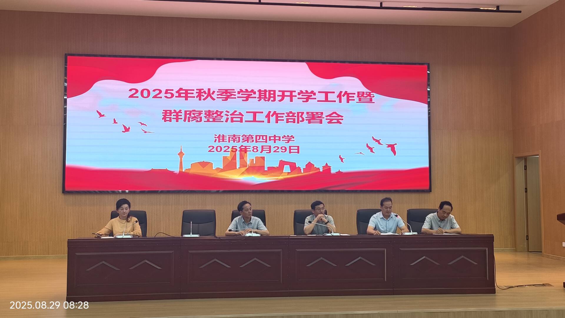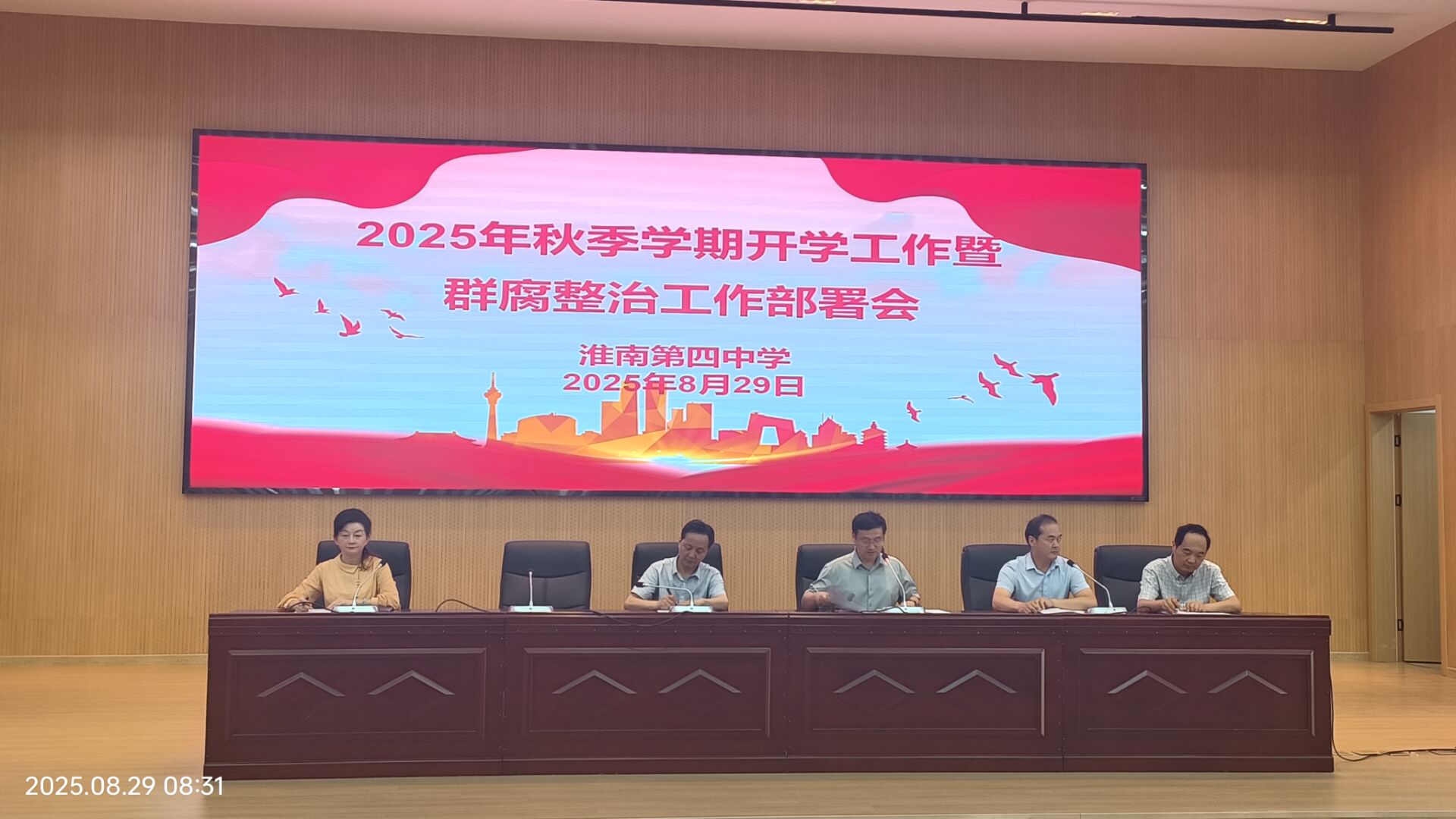 为确保秋季学期平稳有序开学,扎实推进群腐整治等重点工作,8月29日上午8点半,淮南第四中学在报告厅召开2025年秋季学期开学工作暨群腐整治工作部署会。全体教师参会,会议由党委委员、副校长李永兴主持。