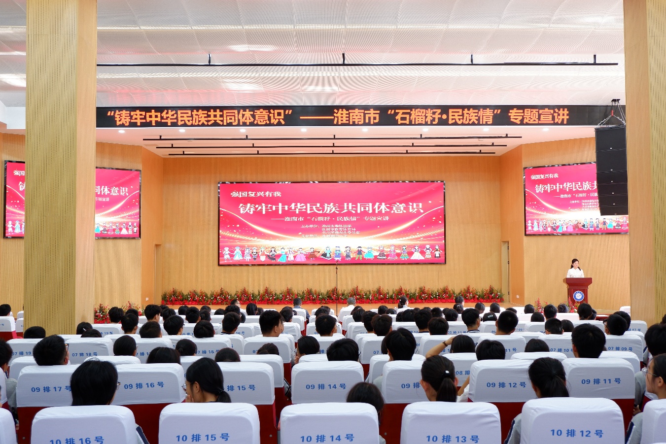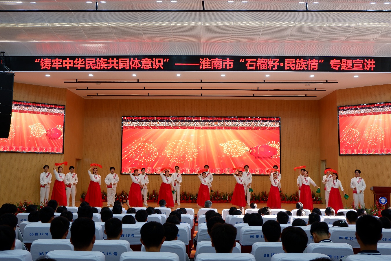 9月5日下午,报告厅里传来阵阵掌声!一场由我校师生自编自演的“民族团结”主题文艺汇演正在这里热烈举行。这不仅仅是一次普通的校园演出,更是铸牢中华民族共同体意识教育实践活动暨淮南市“石榴籽·民族情”专题宣讲的启动现场。