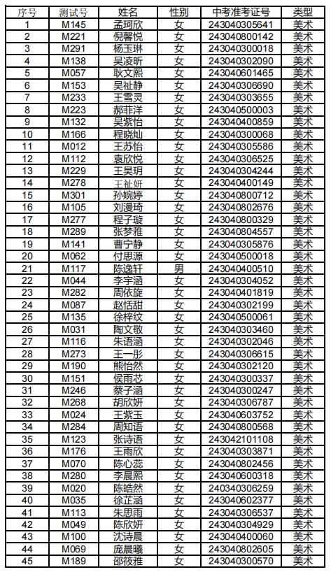 依据《淮南市教育体育局关于做好2024年普通中小学招生入学工作的通知》中“各校按照专业测试成绩从高分到低分整理,按特长生自主招生计划数1.5倍比例报送考生测试成绩(百分制)”及“专项测试成绩不得低于专项测试总分值的60%”的要求,现对参加美术专业测试入围名单予以公示,公示时间为2024年6月24日至6月29日。