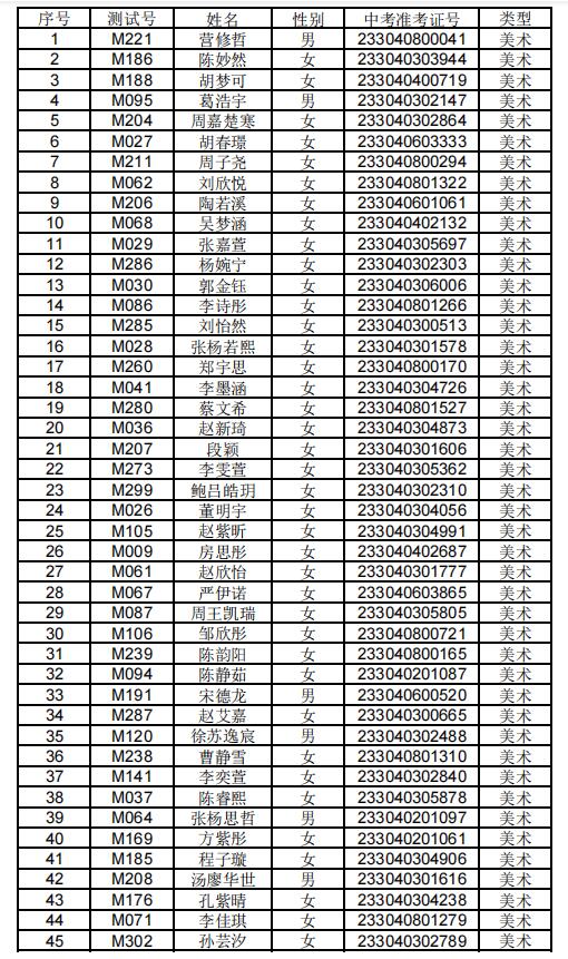 依据《淮南市教育体育局关于做好2023年普通中小学招生入学工作的通知》中“各校按照专业测试成绩从高分到低分整理,按特长生自主招生计划数1.5倍比例报送考生测试成绩”及“专项测试成绩不得低于专项测试总分值的60%”的要求,现对参加入围名单(美术最后一名出现名次并列)予以公示,公示时间为2023年6月25日至6月30日。