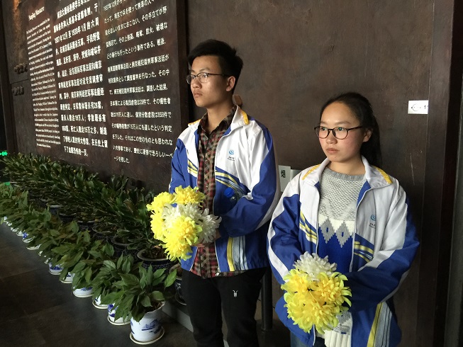 同学们身穿校服,手持校旗来到南京大屠杀纪念馆。他们自发把一朵朵黄菊花摆在碑前,鞠躬默哀,祈愿逝者安息。纪念馆中,一组组触目惊心的图片,一段段铁铮铮的文字,一场场惨绝人寰的杀戮,使同学们表情凝重,心情感伤。“万人坑”中遇难者的遗骨透出的一股股悲凉气息让同学们意识到落后就要挨打,作为中学生应铭记历史,奋发图强,为中华的繁荣贡献自己的力量。