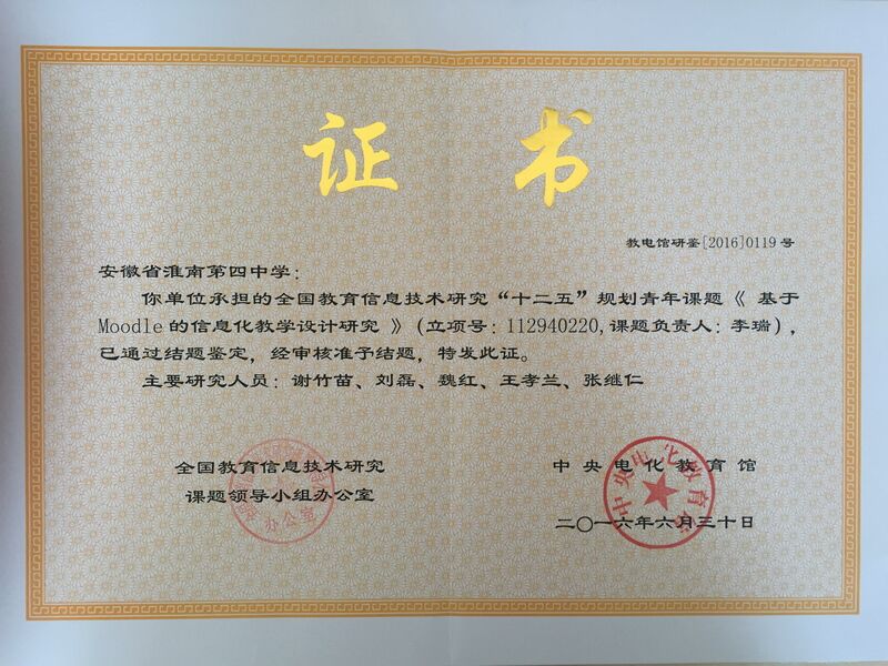 该课题(课题立项号 112940220 )于 2011 年 8 月被中央电化教育馆正式确立立项,结题号“教电馆研鉴 [2016]0119 号”,结题时间 2016 年 6 月 30 日。该课题探讨了 Moodle 网络教学平台的功能体系,在构建 Moodle 教学平台的基础上,探索了基于 Moodle 的信息技术课堂教学设计的基本原则和方法,并进行了教学实践研究。该课题对高中信息技术学科及其它学科实施信息化教学提供理论和实践上的借鉴,具有一定实践意义。